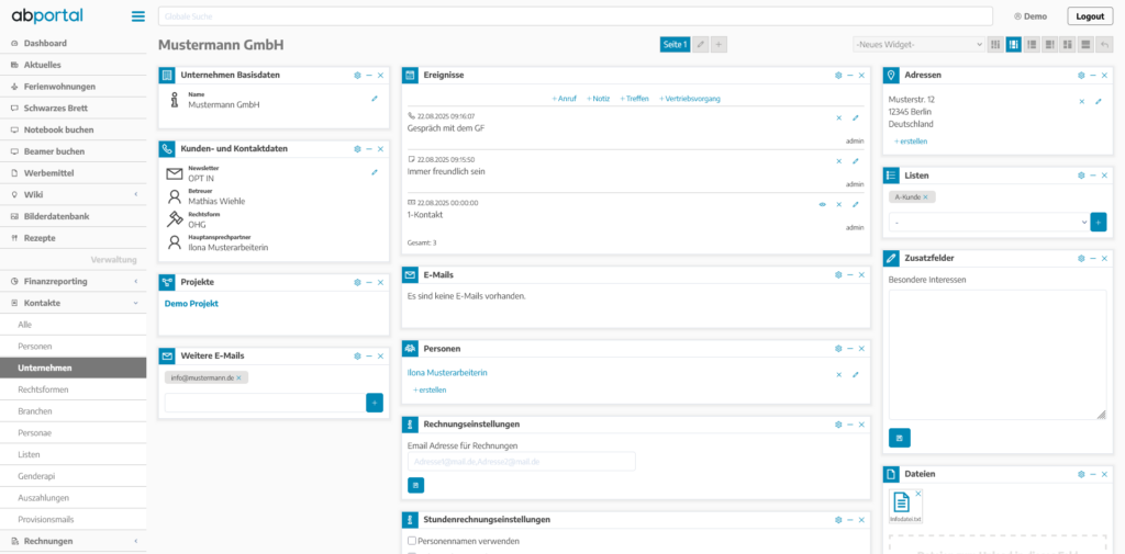 Dank individuell anpassbarer Dashboards und Widgets behalten Sie alle relevanten Kennzahlen im Blick. Gleichzeitig passt sich das System nahtlos an Ihr firmenspezifisches Corporate Design an – abportal, die Plattform das nicht nur effizient arbeitet, sondern auch perfekt zu Ihrem Unternehmen passt.